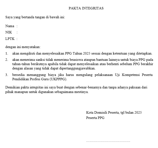 - Scan asli Pakta Intergritas yang telah ditandatangi peserta di atas materai Rp 10.000. Pakta Intergritas diunduh dari SIMPKB saat Konfirmasi Kesedian . Tipe File PDF maksimal 1 MB, contoh penamaan dokumen (Pakta_NOSIMPKB_BidangStudiPPG) , tanggal dan Tempat di Fakta Integritas disesuaikan dengan tanggal ketika lapor diri